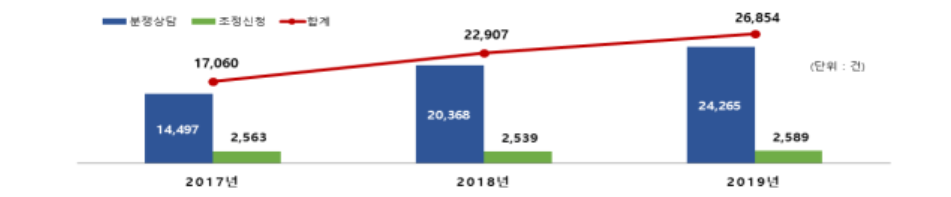 □ ‘19년 4개 분쟁조정위원회로 접수된 분쟁조정 신청은 총 26,854건으로 ‘18년(22,907건) 대비 약 17% 증가하였다.