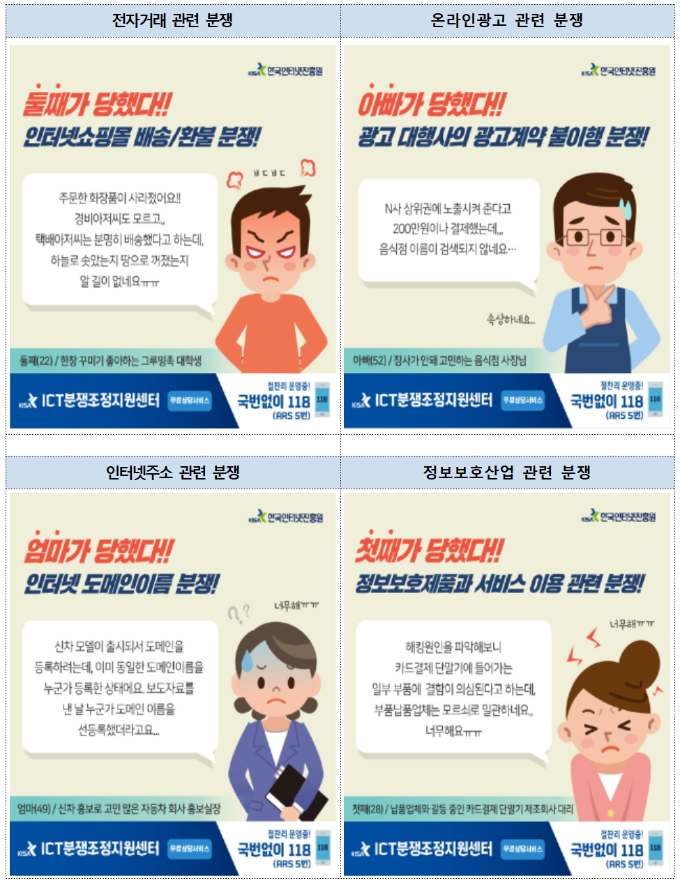 o ICT 분야 온라인 거래시 분쟁조정은 현재 한국인터넷진흥원(이하 ‘KISA’)의 “ICT 분쟁조정지원센터”를 통해 ▲전자거래, ▲온라인 광고, ▲인터넷 주소, ▲정보보호산업 등 4개 분야이다.