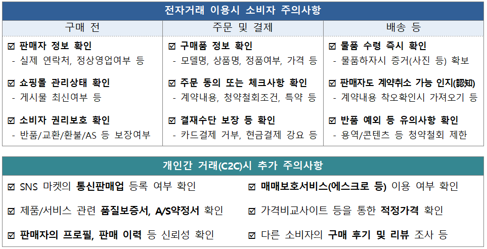 o 따라서, 온라인 쇼핑 거래시 피해 방지를 위해서는 구매 전, 주문 및 결재, 배송 등 각 과정에서 이용자의 세심한 주의가 필요하다. 특히 개인간 거래 시에는 ▲판매자 연락처, ▲정상영업 여부 등을 반드시 확인해야 한다. 실제로 연락두절, 사이트 폐쇄 등 판매자의 ‘먹튀’로 인한 분쟁이 발생하는 경우는 이용자 피해 구제가 쉽지 않은 것이 현실이다.