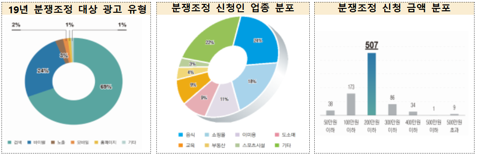 o 분쟁조정 신청은 300만원 이하 금액에서 대다수 발생(95%)하고, 음식, 쇼핑몰, 도소매 등 소상공인 업종에 대한 검색광고(69%) 분야에서 계약 내용과 다르게 이루어지는 것이 주요 원인이다. 특히, 최근에는 블로그, 카페댓글, SNS 등을 활용한 바이럴 마켓팅 관련 분쟁도 증가*하는 추세이다.